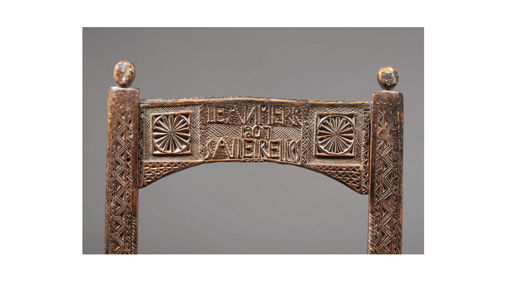 La traverse haute est sculptée de deux coeurs, entre trois fleurs épanouies. La traverse médiane est ornée de trois animaux (loup, mouton, chèvre ?) et d’une grande fleur stylisée, d’un coeur et de rosaces dans un réseau de dents de loup. Au revers, la traverse haute est gravée d’un cartouche portant la signature et la date « SALLEIRELLES 1804 », entre deux fleurs épanouies. La traverse médiane est occupée par un décor cinétique à base de losanges inscrits les uns dans les autres, en creux ou en relief, qui sous différents angles de lumière, produisent un effet de moiré donnant l’impression d’une oeuvre changeante et mouvante. À noter l’emplacement d’une ancienne mortaise sur les montants, repentir de l’artisan qui a préféré descendre l’assise de son siège pour la dentellière. (Paillage postérieur.) Début du XIXe siècle. H : 98,8 cm