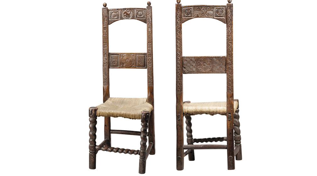 Les montants, sommés de deux têtes humaines, sont sculptés de rosaces, rouelles et fenestrage. Sur la traverse haute, décor d’un lion circonscrit, entre deux fleurs épanouies inscrites dans un carré. La traverse médiane est ornée d’une grande fleur épanouie encadrée de deux plioirs à dentelles figurant un loup surmontant une rosace. Au revers, la traverse haute est signée et datée « JEAN PIERE SALLEIRELLES 1807 », entre deux rouelles inscrites dans un carré. La traverse médiane est sculptée d’une fleur épanouie dans un décor de losanges imbriqués en creux et en relief. Les pieds et la traverse antérieurs de l’assise sont torses. (Le pied arrière droit a été enté de façon maladroite d’où un déséquilibre au niveau de l’assise. Paillage postérieur.) Début du XIXe siècle. H : 106,3 cm